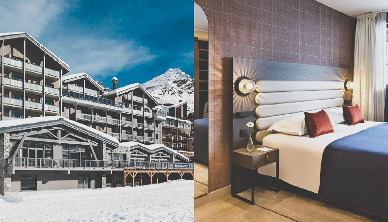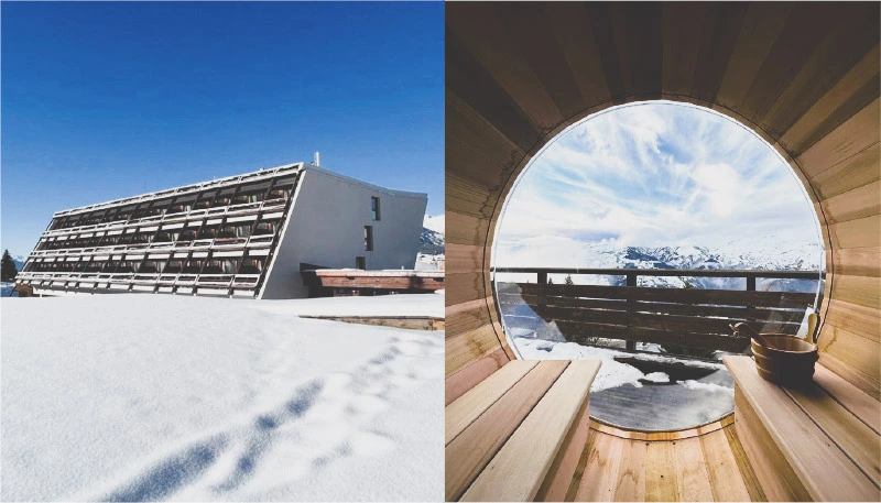 L’établissement de quatre-vingt-huit chambres est situé au pied des pistes et à dix minutes de marche de l’arrivée du funiculaire qui relie Bourg-Saint-Maurice à Arc 1600 en sept minutes. Rénové par le cabinet Patriarche, il perpétue l’héritage architectural de Charlotte Perriand, qui contribua à l’identité de la station sortie de terre dans les années 1960.