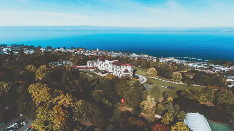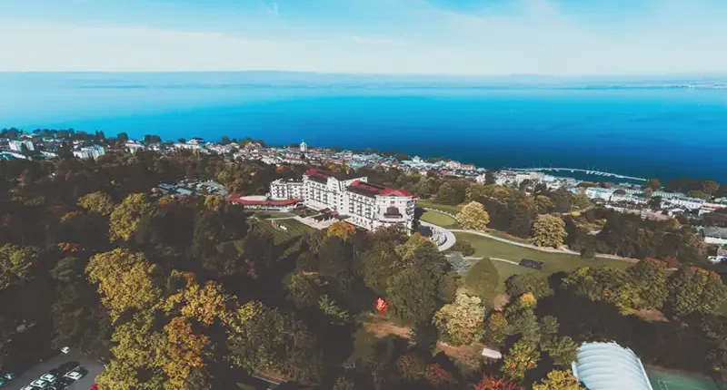 Sur les rives du lac Léman, caché dans un parc de 19 hectares, l’Hôtel Royal est le fleuron du luxueux complexe Évian Resort.