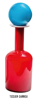 Bouteille en verre rouge, bouchon en verre bleu. Étiquette de l’éditeur Holmegaard. (48 cm).