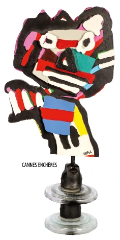 Personnage sculpté en bois découpé et peint sur un socle en métal et verre, signé Karel Appel (1921-2006). (71,5 × 65 × 17 cm).