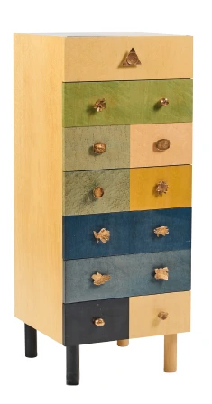 Semainier “Genesio”, signé Alik Cavalière (1926-1998), en bois, mélaminé et bronze doré. Éditeur Zanotta, vers 1990. (128 × 52 × 50 cm).