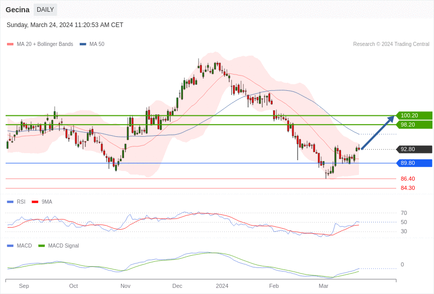 Si le cours se maintient au-dessus des 89,80 euros, il pourrait atteindre dans un premier temps 98,20 euros, puis grimper éventuellement à 100,20 euros.