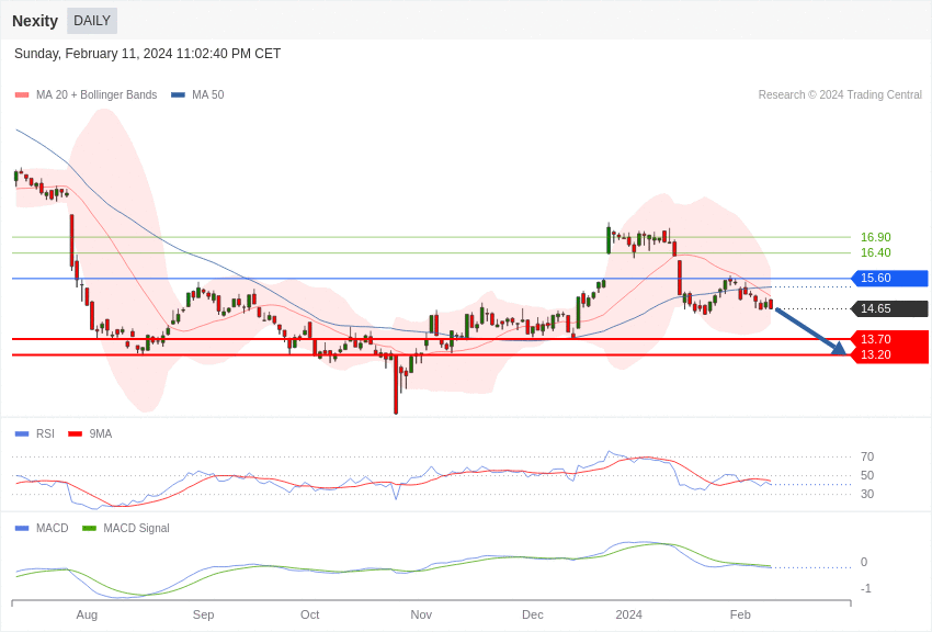 La tendance graphique de Nexity est négative sous la résistance de 15,60 euros.