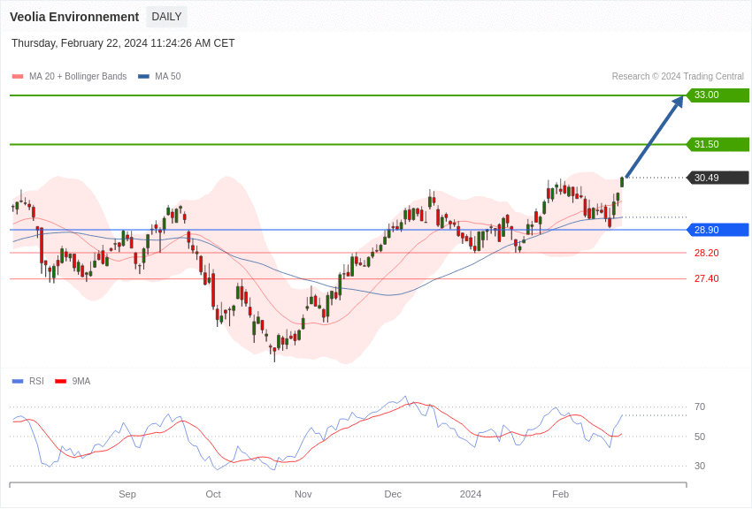 L’action Veolia affiche une tendance positive tant qu’elle se maintient au-dessus de 28,90 euros.