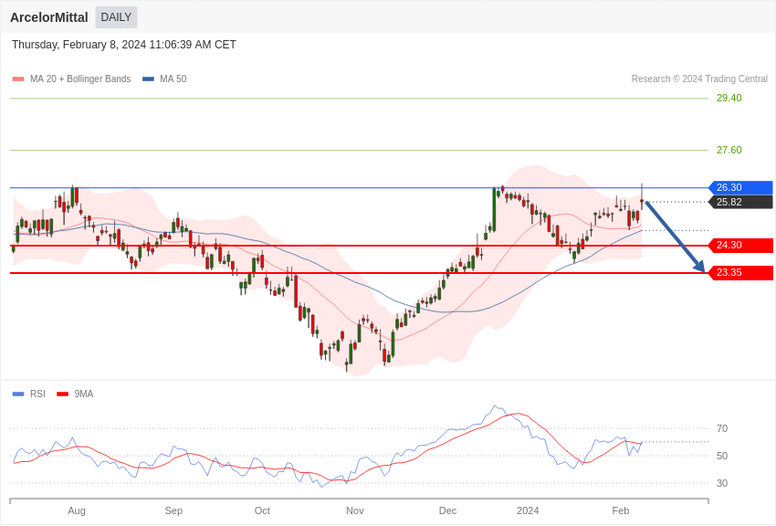 La configuration du titre du groupe sidérurgique est négative tant qu’il évolue sous les 26,30 euros.