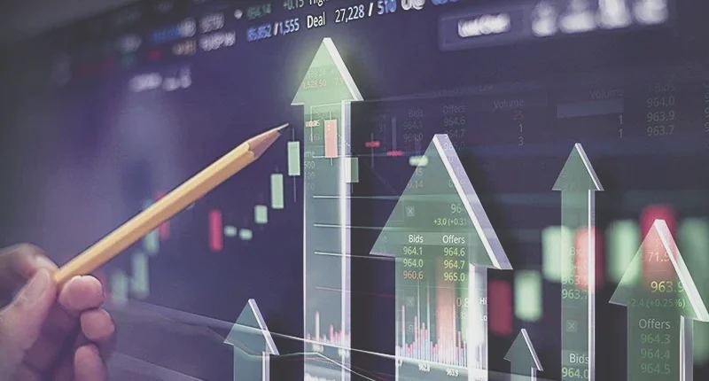 main tenant un crayon devant un visuel boursier (© Shutterstock)